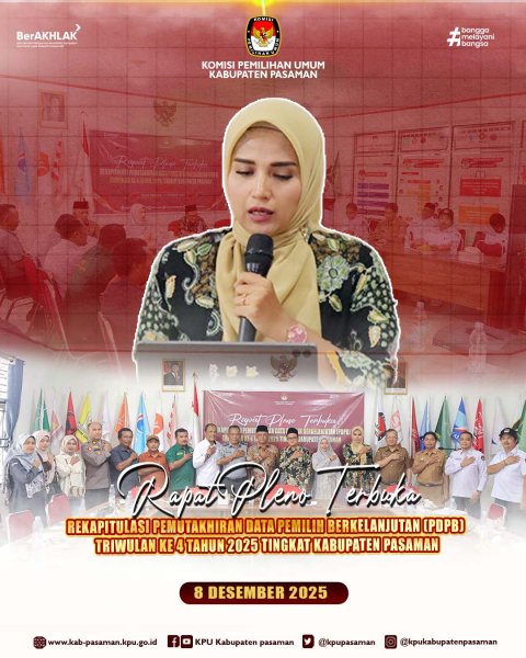 kab-pasaman.kpu.go.id-Pasaman, 8 Desember 2025, Komisi Pemilihan Umum (KPU) Kabupaten Pasaman melaksanakan Rapat Pleno Terbuka Rekapitulasi Pemutakhiran Data Pemilih Berkelanjutan (PDPB) Triwulan ke 4 Tahun 2025, bertempat di Media Center KPU Kabupaten Pasaman. Kegiatan ini digelar sebagai bentuk komitmen KPU terhadap ketersediaan data pemilih yang akurat, mutakhir, dan berkualitas menjelang penyelenggaraan Pemilu mendatang.