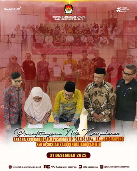 kab-pasaman.kpu.go.id -Komisi Pemilihan Umum (KPU) Kabupaten Pasaman melaksanakan Penandatanganan Nota Kesepahaman (MoU) antara KPU Kabupaten Pasaman dengan Sekolah Tinggi Agama Islam Yayasan Dakwah Islamiyah (STAI-YDI) Lubuk Sikaping, yang dirangkaikan dengan kegiatan Sosialisasi Pendidikan Pemilih. Kegiatan ini berlangsung di Aula STAI-YDI Lubuk Sikaping, Rabu (31/12).