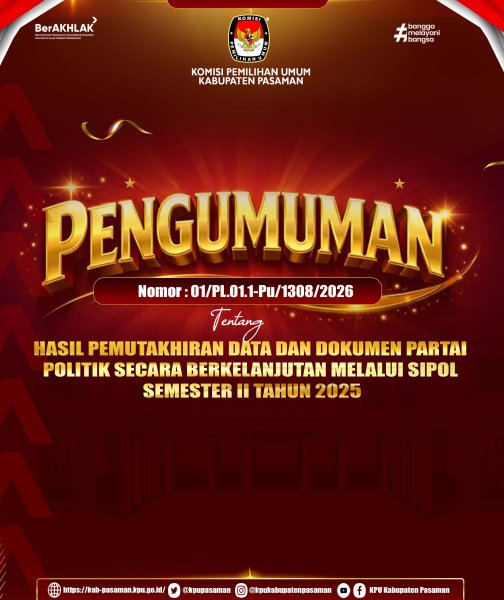 #temanpemilih, berikut disampaikan Pengumuman nomor : 01/PL.01.1-Pu/1308/2026 tentang Hasil Pemutakhiran Data Dan Dokumen Partai Politik Secara Berkelanjutan Melalui Sipol Semester II Tahun 2025