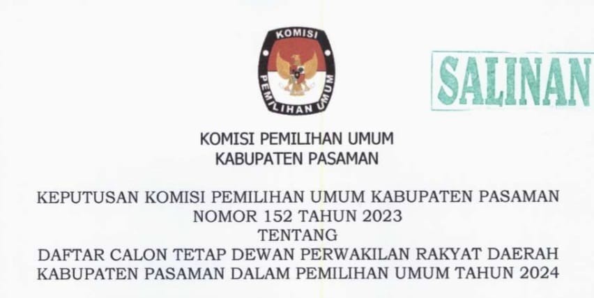 Berikut disampaikan Surat Keputusan Komisi Pemilihan Umum Kabupaten Pasaman Nomor 152 Tahun 2023 Tentang Daftar Calon Tetap Dewan Perwakilan Rakyat Daerah Kabupaten Pasaman Dalam Pemilihan Umum Tahun 2024: