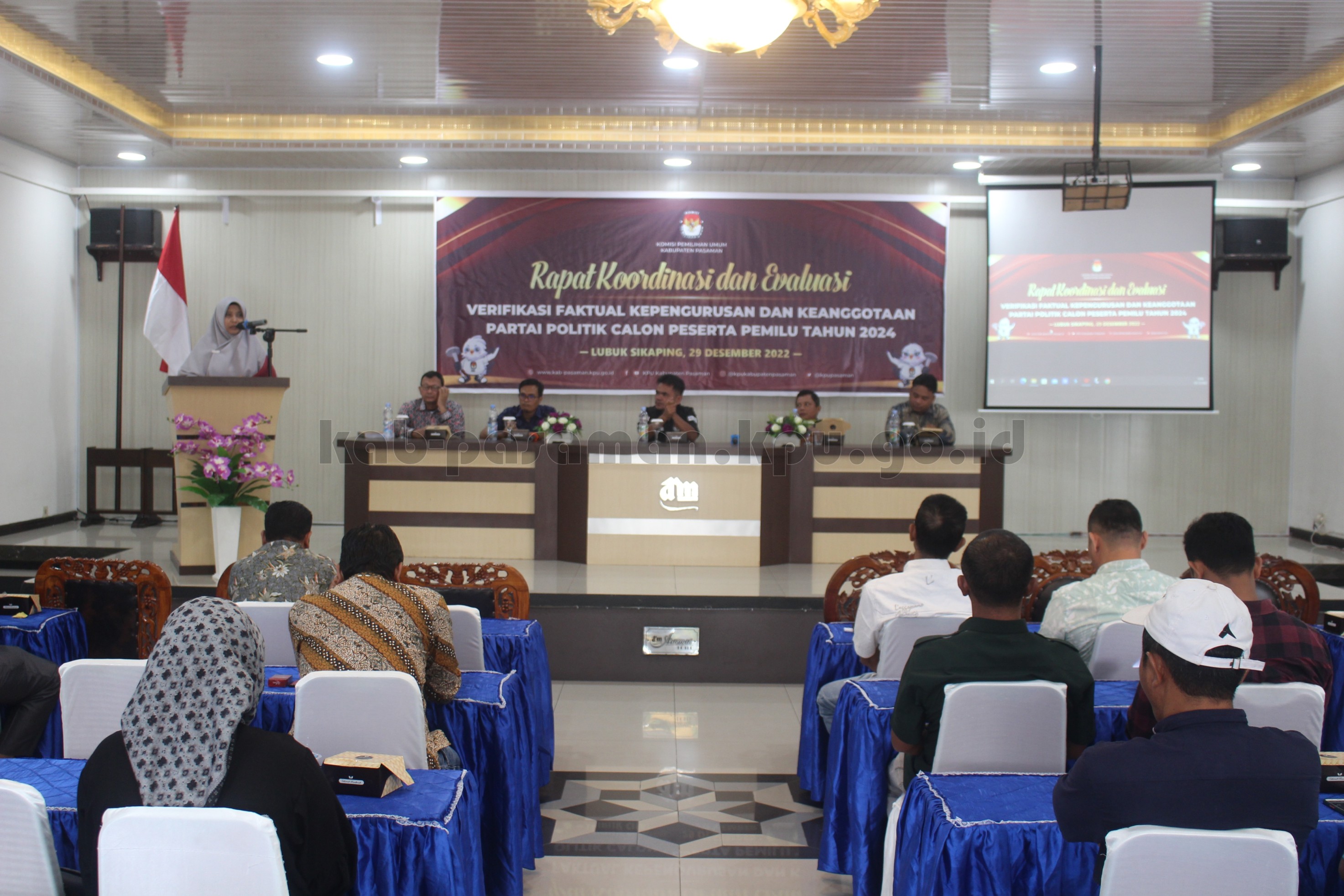 Lubuk Sikaping, www.kab-pasaman.kpu.go.id – KPU Kabupaten Pasaman melaksanakan kegiatan Rapat Koordinasi dan Evaluasi Verifikasi Faktual Kepengurusan dan Keanggotaan Partai Politik Calon Peserta Pemilu Tahun 2024 bertempat di Aula Hotel Arumas Lubuk Sikaping, Kamis (29/12).
