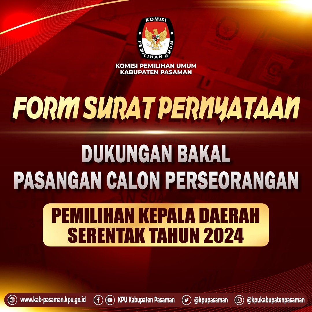 Hai #TemanPemilih, berikut disampaikan Surat Pernyataan Dukungan Bakal Pasangan Calon Perseorangan dalam Pemilihan Bupati dan Wakil Bupati Pasaman Tahun 2024 dan Surat Pernyataan Identitas Pendukung Bakal Pasangan Calon Bupati dan Wakil Bupati Pasaman Pemilihan Tahun 2024
