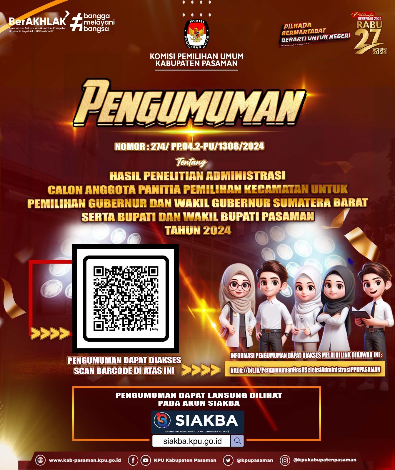 Hai #TemanPemilih, Berikut disampaikan Pengumuman KPU Kabuaten Pasaman Nomor: 274/PP.04.2-PU/1308/2024 Tentang HASIL PENELITIAN ADMINISTRASI CALON ANGGOTA PANITIA PEMILIHAN KECAMATAN UNTUK PEMILIHAN GUBERNUR DAN WAKIL GUBERNUR SUMATERA BARAT SERTA BUPATI DAN WAKIL BUPATI PASAMAN TAHUN 2024