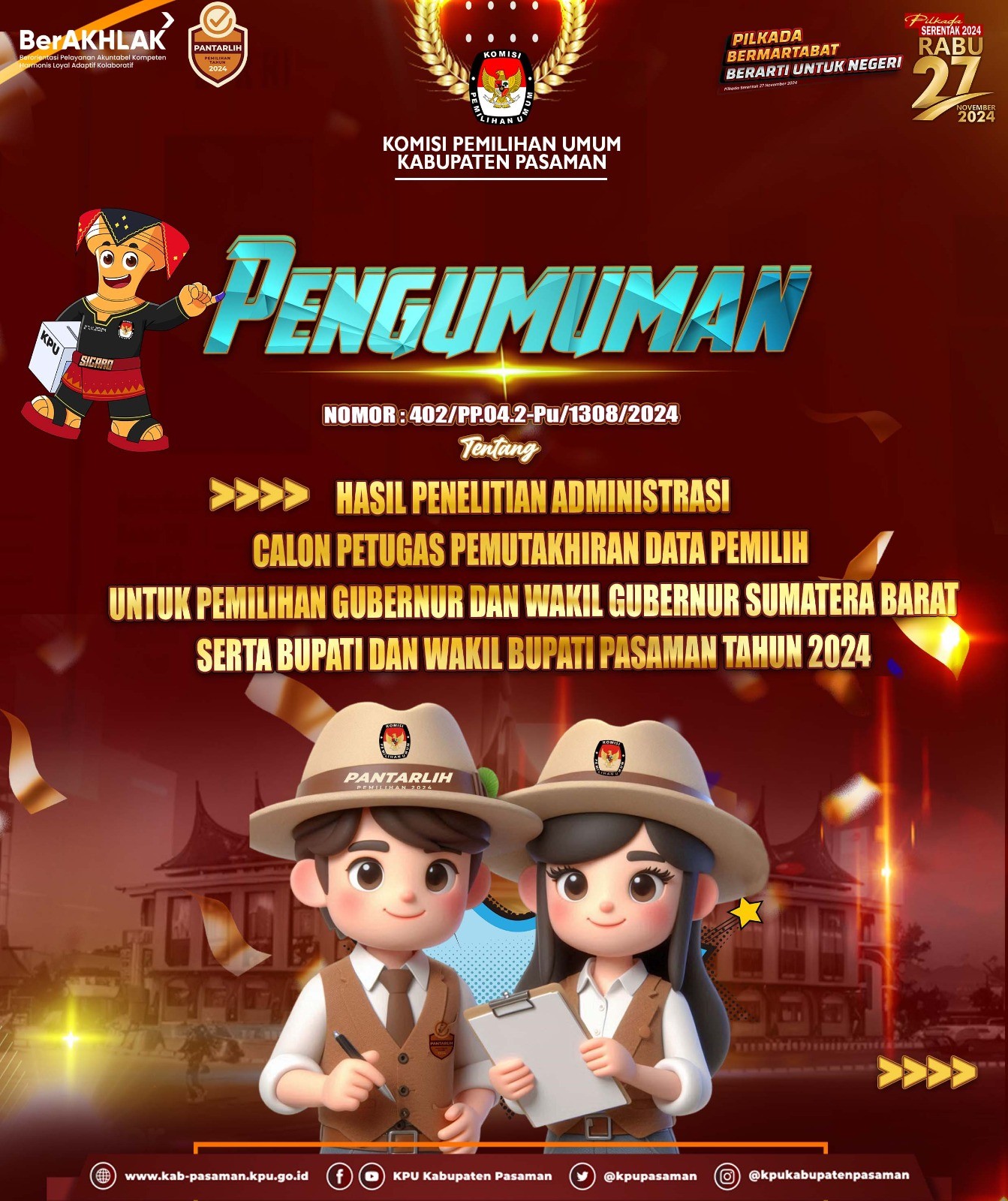Hai #TemanPemilih, berikut disampaikan pengumuman Nomor 402/PP.04-2.Pu/1308/2024 tentang Hasil Penelitian Administrasi Calon Petugas Pemutakhiran Data Pemilih Untuk Pemilihan Gubernur dan Wakil Gubernur Sumatera Barat serta Bupati dan Wakil Bupati Pasaman Tahun 2024