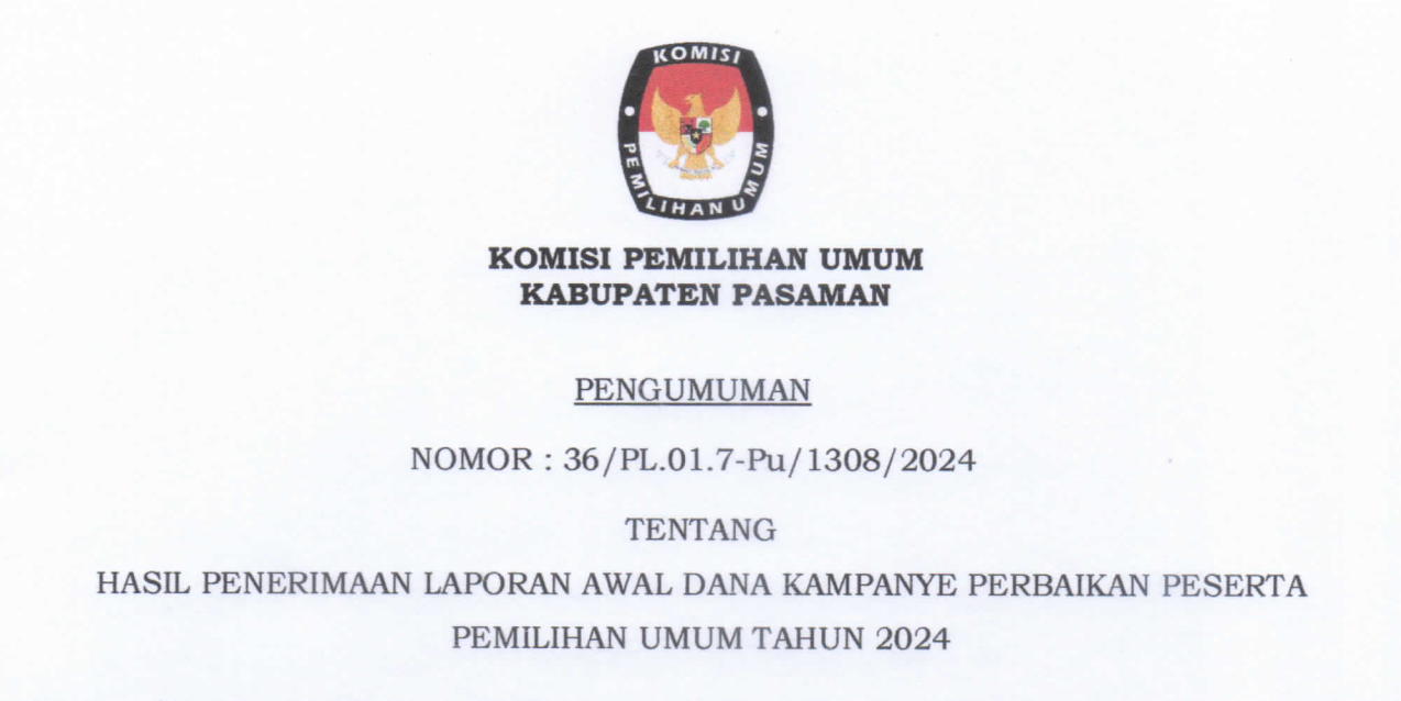 Berikut disampaikan Pengumuman KPU Kabupaten Pasaman Nomor: 36/PL.01.7-Pu/1308/2024 tentang Hasil Penerimaan Laporan Awal Dana Kampanye Perbaikan Peserta Pemilihan Umum Tahun 2024