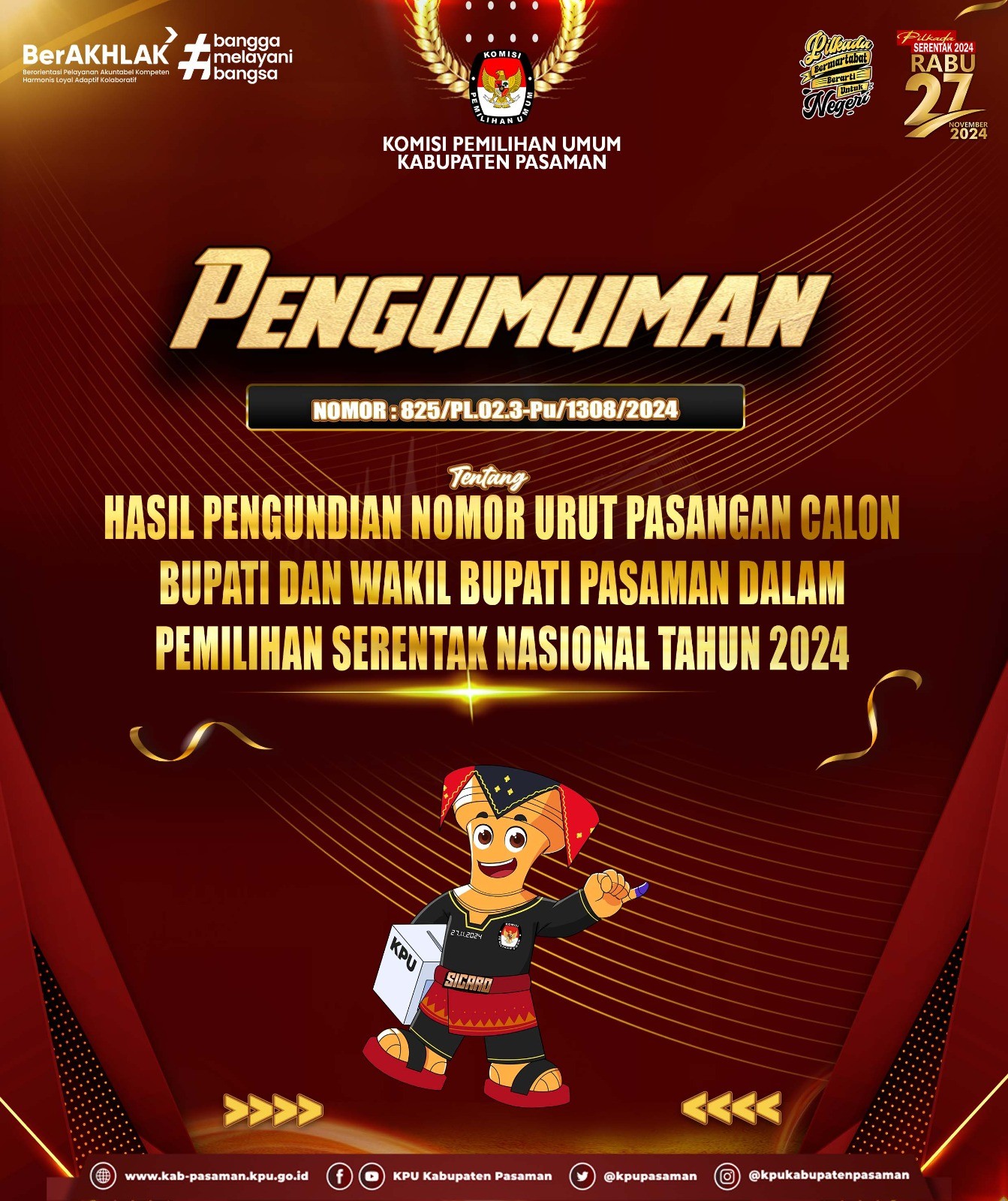 Hai #TemanPemilih, berikut disampaikan Pengumuman Nomor 825/PL.02.3-Pu/1308/2024 tentang Hasil Pengundian Nomor Urut Pasangan Calon Bupati dan Wakil Bupati Pasaman dalam Pemilihan Serentak Nasional Tahun 2024.