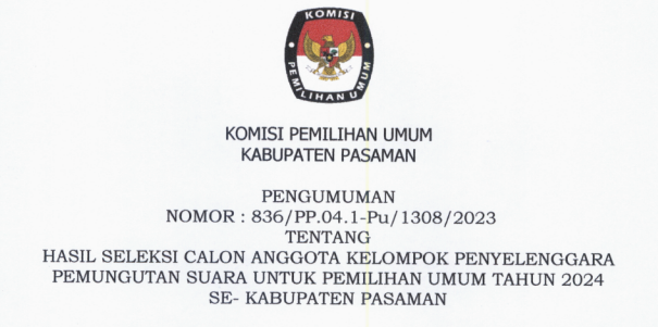 Berikut disampaikan Pengumuman Nomor: 836/PP.04.1-Pu/1308/2023 tentang Hasil Seleksi Calon Anggota Kelompok Penyelenggara Pemungutan Suara Untuk Pemilihan Umum Tahun 2024 Se-Kabupaten Pasaman.