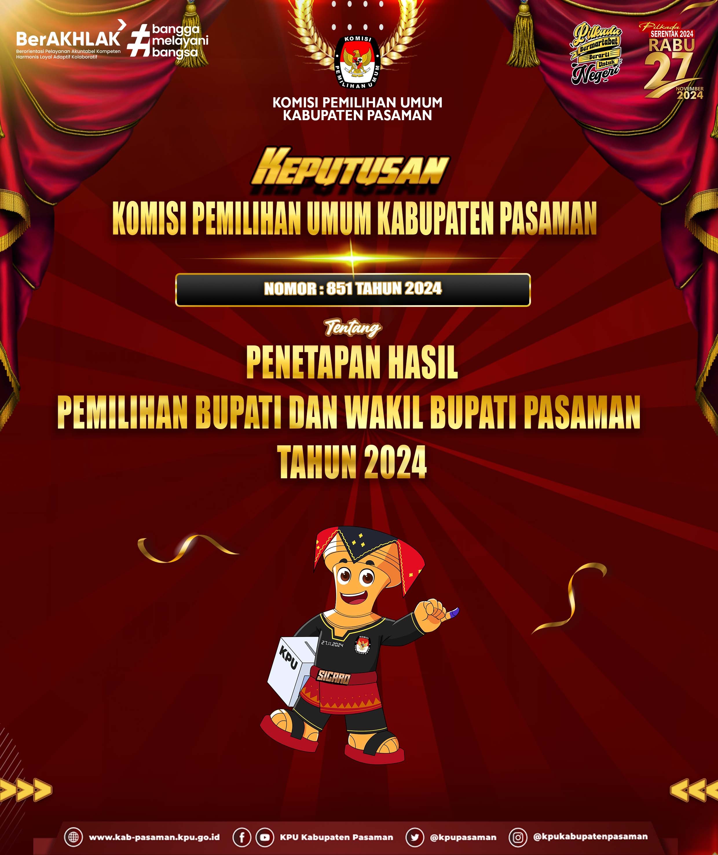 KEPUTUSAN KOMISI PEMILIHAN UMUM KABUPATEN PASAMAN NOMOR 851 TAHUN 2024 TENTANG PENETAPAN HASIL PEMILIHAN BUPATI DAN WAKIL BUPATI TAHUN 2024PASAMAN
