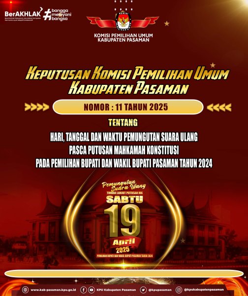 #temanpemilih, berikut disampaikan Keputusan Komisi Pemilihan Umum Kabupaten Pasaman Nomor 11 tahun 2025 tentang Hari, Tanggal dan Waktu Pemilihan Suara Ulang Pasca Putusan Mahkamah Konstitusi pada Pemilihan Bupati dan Wakil Bupati Pasaman tahun 2024