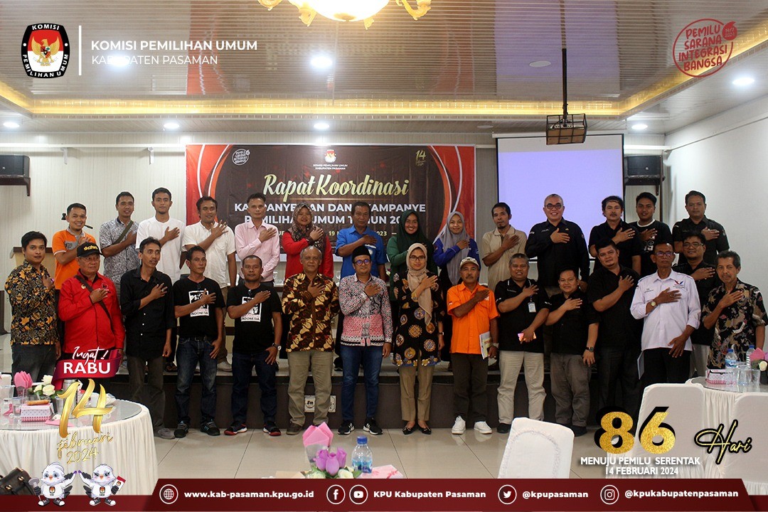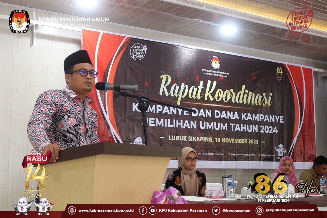 Lubuk Sikaping, www.kab-pasaman.kpu.go.id - Memasuki tahapan kampanye Pemilu 2024, yang akan dilaksanakan selama 75 hari terhitung sejak 28 November 2023 hingga 10 Februari 2024, KPU Kabupaten Pasaman menggelar Rapat Koordinasi Kampanye dan Dana Kampanye Pemilihan Umum Tahun 2024, pada Minggu (19/11).