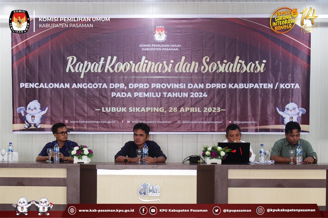 Lubuk Sikaping, www.kab-pasaman.kpu.go.id – KPU Kabupaten Pasaman menggelar kegiatan Rapat Koordinasi dan Sosialisasi Pencalonan Anggota DPR, DPRD Provinsi dan DPRD Kabupaten/Kota pada Pemilu tahun 2024, bertempat di Aula Hotel Arumas Lubuk Sikaping, Jum'at (28/4).