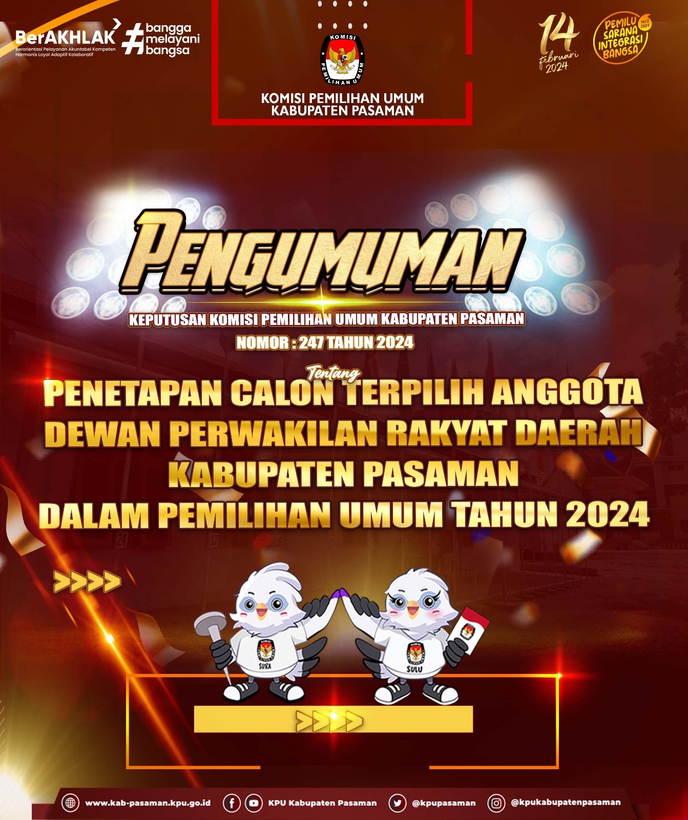 Hai #TemanPemilih, berikut disampaikan Keputusan Komisi Pemilihan Umum Kabupaten Pasaman Nomor: 247 Tahun 2024 Tentang Penetapan Calon Terpilih Anggota Dewan Perwakilan Rakyat Daerah Kabupaten Pasaman Dalam Pemilihan Umum Tahun 2024.