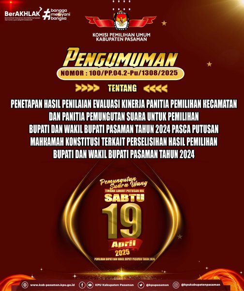 #temanpemilih, berikut disampaikan Pengumuman nomor : 100/PP.04.2-Pu/1308/2025 tentang Penetapan Hasil Penilaian Evaluasi Kinerja Panitia Pemilihan Кесаmatan Dan Panitia Pemungutan Suara Untuk Pemilihan Bupati Dan Wakil Bupati Pasaman Tahun 2024 Pasca Putusan Манкamаh Konstitusi Terkait Perselisihan Hasil Pemilihan Bupati Dan Wakil Bupati Pasaman Tahun 2024
