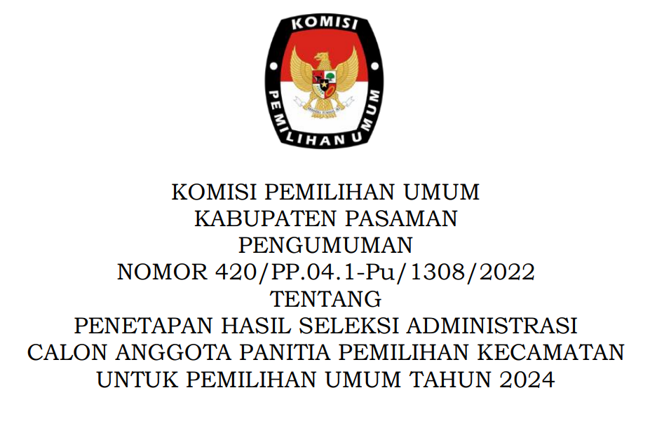 Berikut disampaikan Keputusan KPU Pasaman Nomor : 420/PP-04.1-Pu/1308/2022 Tentang Penetapan Hasil Seleksi Administrasi Panitia Pemilihan Kecamatan untuk Pemilu 2024.