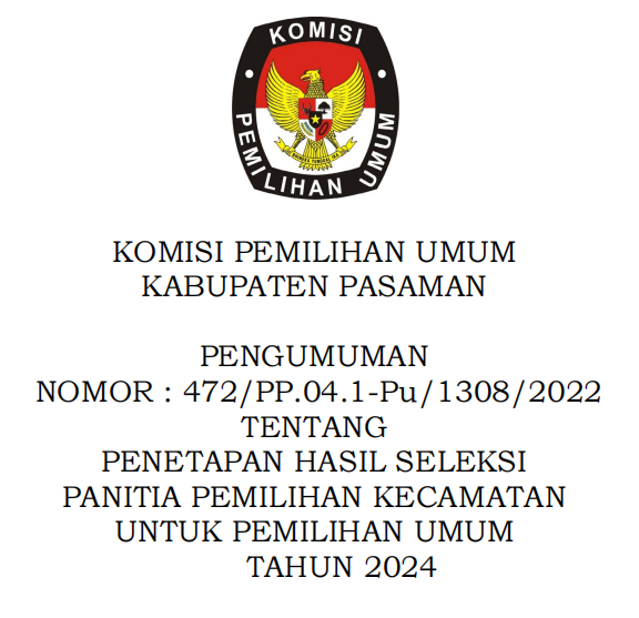 Berikut disampaikan Pengumuman Penetapan Hasil Seleksi Panitia Pemilihan Kecamatan Untuk Pemilihan Umum Tahun 2024 berdasarkan Keputusan KPU Kabupaten Pasaman Nomor 472/PP.04.1-Pu/1308/2022 tentang Penetapan Hasil Seleksi Panitia Pemilihan Kecamatan Untuk Pemilihan Umum Tahun 2024.