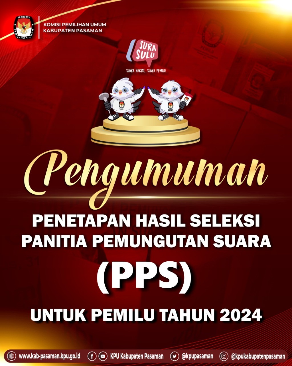 Berikut disampaikan Pengumuman Penetapan Hasil Seleksi Panitia Pemungutan Suara Untuk Pemilihan Umum Tahun 2024 berdasarkan Keputusan KPU Kabupaten Pasaman Nomor 43/PP.04.1-Pu/1308/2023 tentang Penetapan Hasil Seleksi Panitia Pemungutan Suara Untuk Pemilihan Umum Tahun 2024.