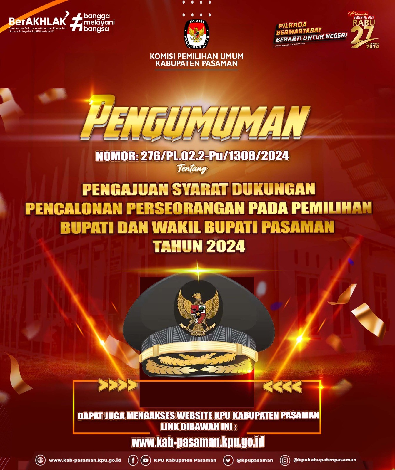 Hai #TemanPemilih, berikut disampaikan Pengumuman Nomor: 276/PL.02.2-pu/1308/2024 Tentang Pengajuan Syarat Dukungan Pencalonan Persorangan Pada Pemilihan Bupati dan Wakil Bupati Pasaman Tahun 2024.