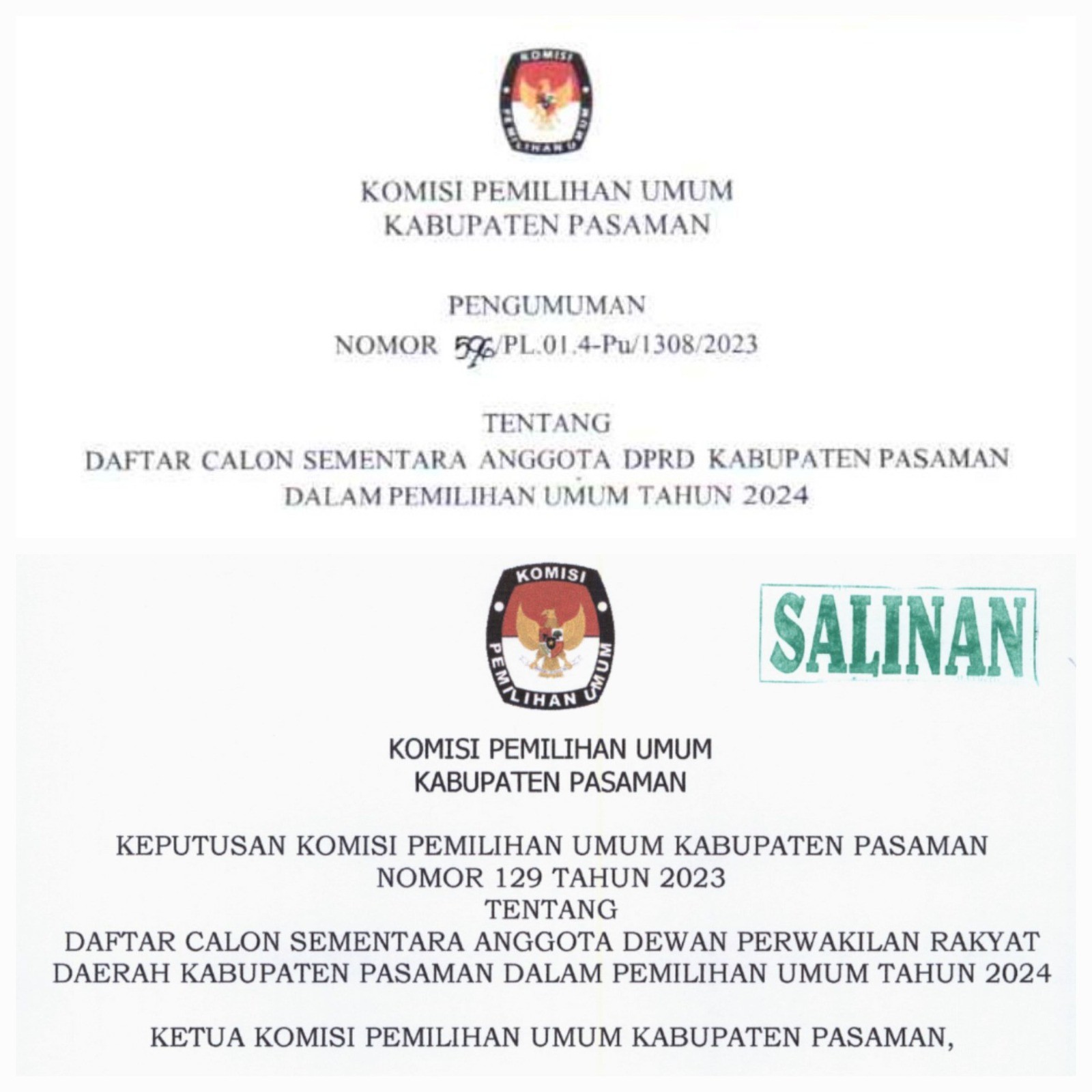 - Keputusan KPU Kabupaten Pasaman Nomor 129 Tahun 2023 Tentang Daftar Calon Sementara Anggota Dewan Perwakilan Rakyat Daerah Kabupaten Pasaman Dalam Pemilihan Umum Tahun 2024