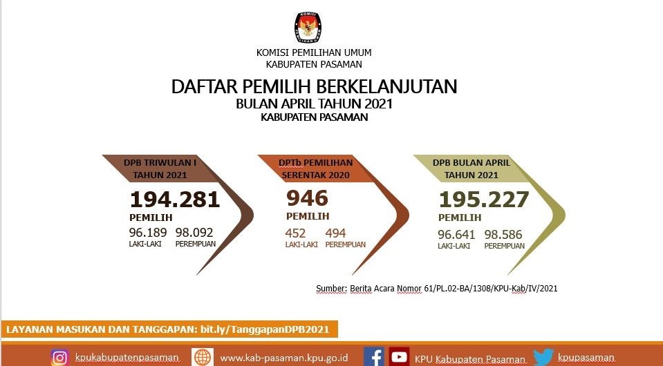 Berdasarkan ketentuan Surat Edaran Ketua KPU RI Nomor: 366/PL.02-SD/01/KPU/IV/2021 tanggal 21 April 2021 perihal Perubahan Surat Ketua KPU RI Nomor 132/PL.02-SD/01/KPU/II/2021 perihal Pemutakhiran Data Pemilih Berkelanjutan Tahun 2021, KPU Kabupaten Pasaman melaporkan PDPB Bulan April tahun 2021 sebagai berikut: