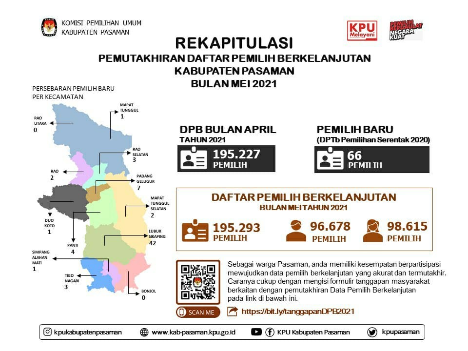 Berdasarkan ketentuan Surat Edaran Ketua KPU RI Nomor: 366/PL.02-SD/01/KPU/IV/2021 tanggal 21 April 2021 perihal Perubahan Surat Ketua KPU RI Nomor 132/PL.02-SD/01/KPU/II/2021 perihal Pemutakhiran Data Pemilih Berkelanjutan Tahun 2021, KPU Kabupaten Pasaman melaporkan PDPB Bulan Mei tahun 2021 sebagai berikut: