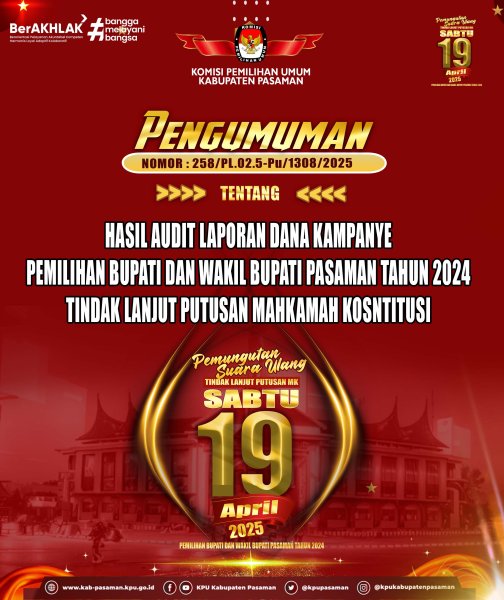#temanpemilih, berikut disampaikan Pengumuman nomor : 258/PL.02.5-Pu/1308/2025 tentang Hasil Hasil Audit Laporan Dana Kampanye Pemilihan Bupati Dan Wakil Bupati Pasaman Tahun 2024 Tindak Lanjut Putusan Mahkamah Kosntitusi.