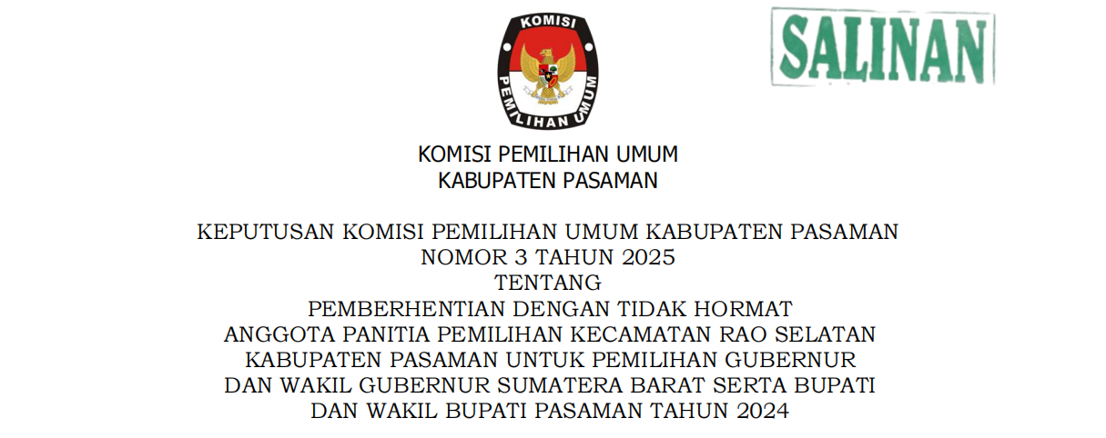 Hai, #TemanPemilih, berikut disampaikan Keputusan Komisi Pemilihan Umum Kabupaten Pasaman Nomor 3 Tahun 2025 Tentang Pemberhentian dengan Tidak Hormat Anggota Panitia Pemilihan Kecamatan Rao Selatan Kabupaten Pasaman untuk Pemilihan Gubernur dan Wakil Gubernur Sumatera Barat serta Bupati dan Wakil Bupati Pasaman Tahun 2024
