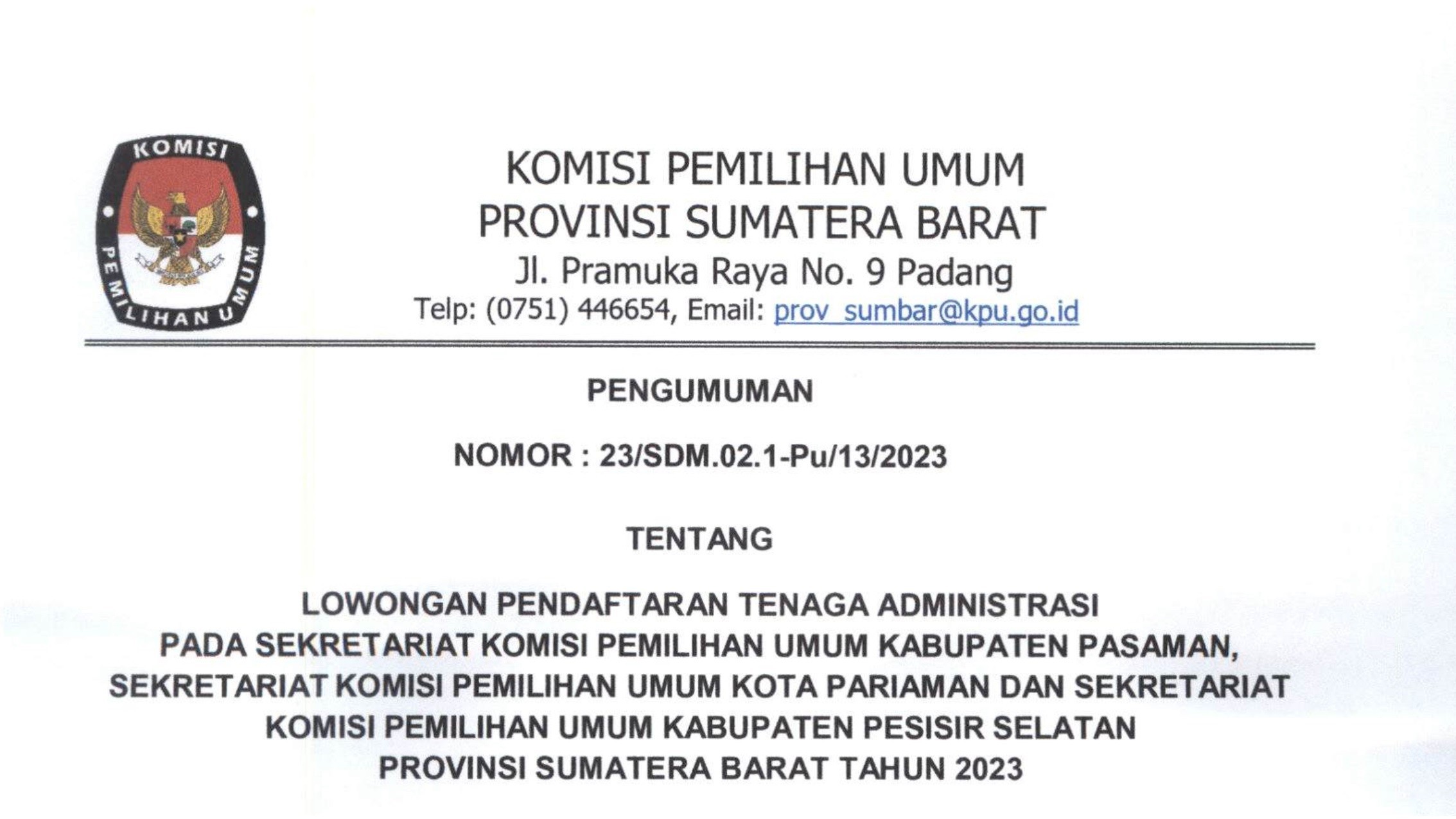 PENGUMUMAN LOWONGAN TENAGA ADMINISTRASI SEKRETARIAT KPU KABUPATEN PASAMAN, KPU KOTA PARIAMAN DAN KPU KABUPATEN PESISIR SELATAN TAHUN 2023 Selasa, 24 Oktober 2023 09:32 444 PENGUMUMAN CONTOH FORM SURAT LAMARAN CONTOH FORM PARPOL CONTOH FORM TIDAK DIBERHENTIKAN CONTOH FORM DRH Bagikan: Dilihat 444 Kali.