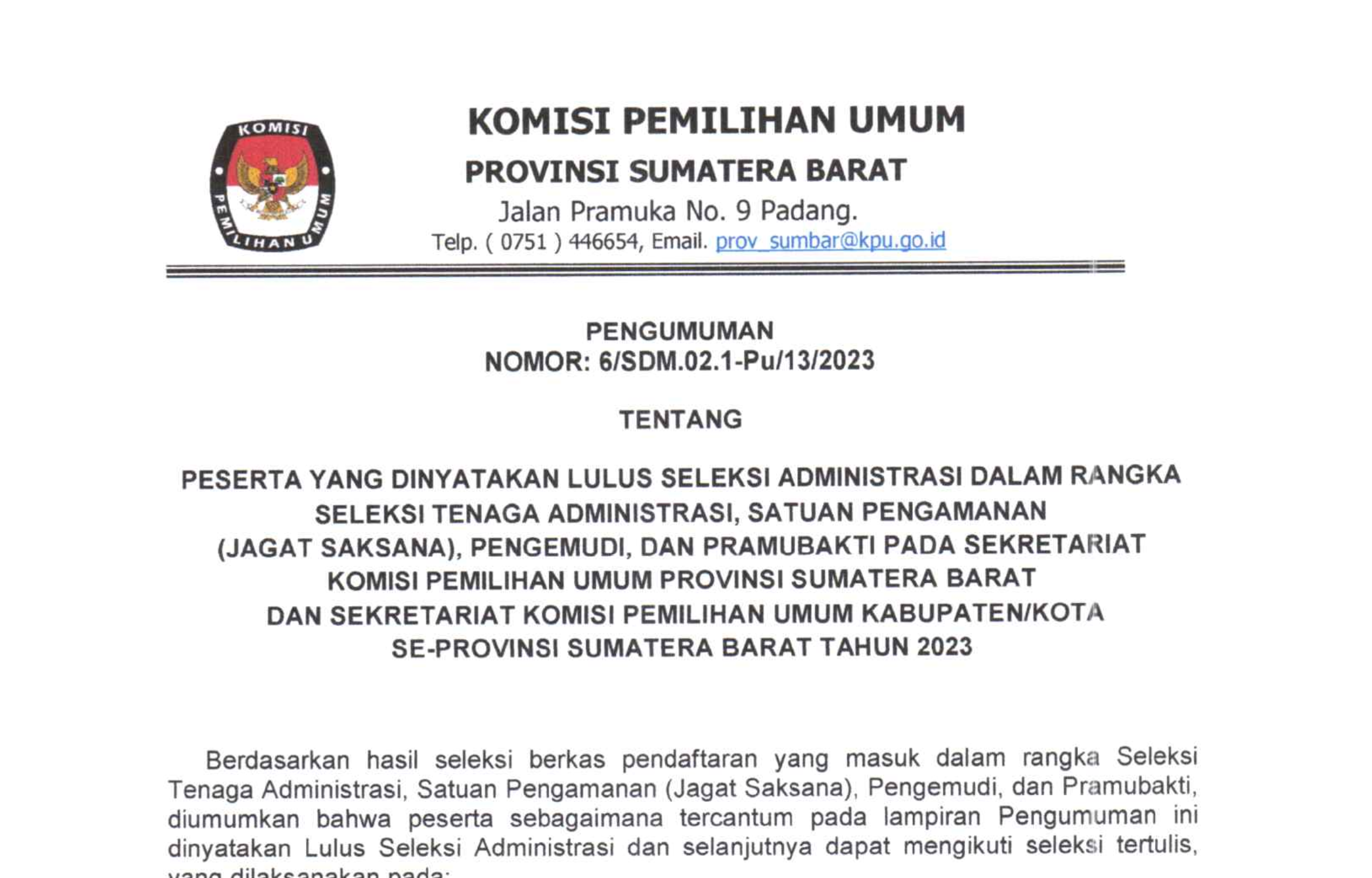 PENGUMUMAN LULUS SELEKSI ADMINITRASI TENAGA ADM, PENGAMANAN, PENGEMUDI, & PRAMUBAKTI DI KPU PROV/KAB/KOTA SE-SUMATERA BARAT TAHUN 2023