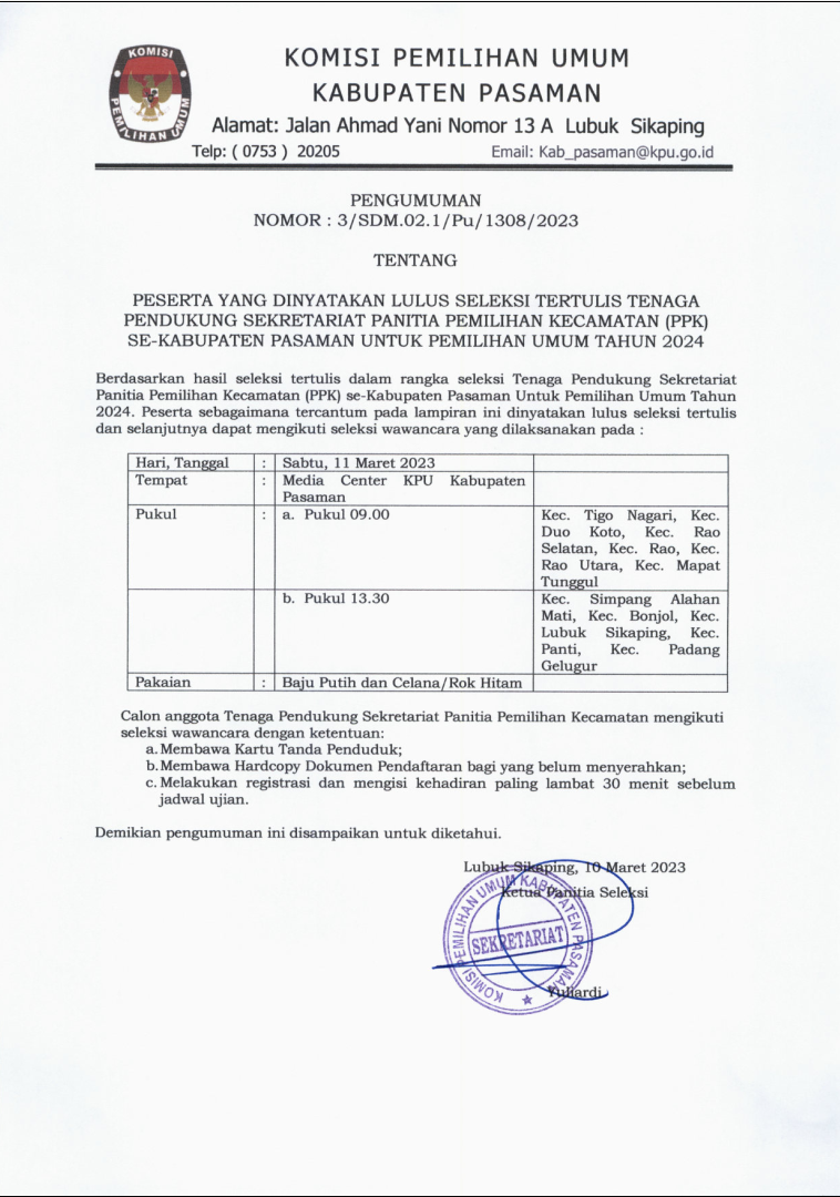 BERIKUT DISAMPAIKAN PENGUMUMAN NOMOR: 3/SDM.02.1/Pu/1308/2023 TENTANG PESERTA YANG DINYATAKAN LULUS SELEKSI TERTULIS TENAGA PENDUKUNG SEKRETARIAT PANITA PEMILIHAN KECAMATAN (PPK) SE-KABUPATEN PASAMAN UNTUK PEMILU TAHUN 2024