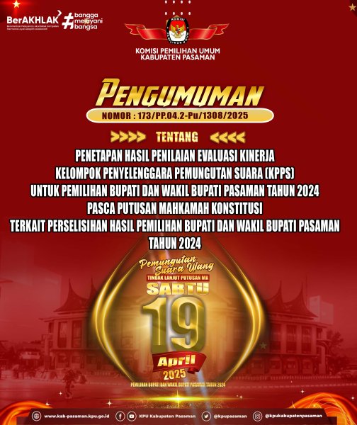 #temanpemilih, berikut disampaikan Pengumuman nomor : 173/PP.04.2-Pu/1308/2025 tentang Penetapan Hasil Penilaian Evaluasi Kinerja Kelompok Penyelenggara Pemungutan Suara (Kpps) Untuk Pemilihan Bupati Dan Wakil Bupati Pasaman Tahun 2024 Pasca Putusan Манкamаh Konstitusi Terkait Perselisihan Hasil Pemilihan Bupati Dan Wakil Bupati Pasaman Tahun 2024.