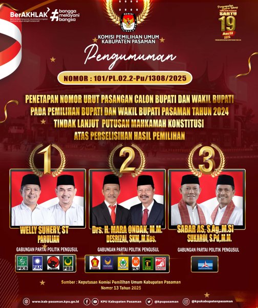 #temanpemilih, berikut disampaikan Pengumuman nomor : 101/PL.02.2-Pu/1308/2025 tentang Penetapan Nomor Urut Pasangan Calon Bupati Dan Wakil Bupati Pada Pemilihan Bupati Dan Wakil Bupati Pasaman Tahun 2024 Tindak Lanjut Putusan Mahkamah Konstitusi Atas Perselisihan Hasil Pemilihan.