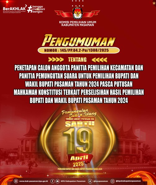 #temanpemilih, berikut disampaikan Pengumuman nomor : 145/PP.04.2-Pu/1308/2025 tentang Penetapan Panitia Pemilihan Кесаmatan Dan Panitia Pemungutan Suara Untuk Pemilihan Bupati Dan Wakil Bupati Pasaman Tahun 2024 Pasca Putusan Манкamаh Konstitusi Terkait Perselisihan Hasil Pemilihan Bupati Dan Wakil Bupati Pasaman Tahun 2024.