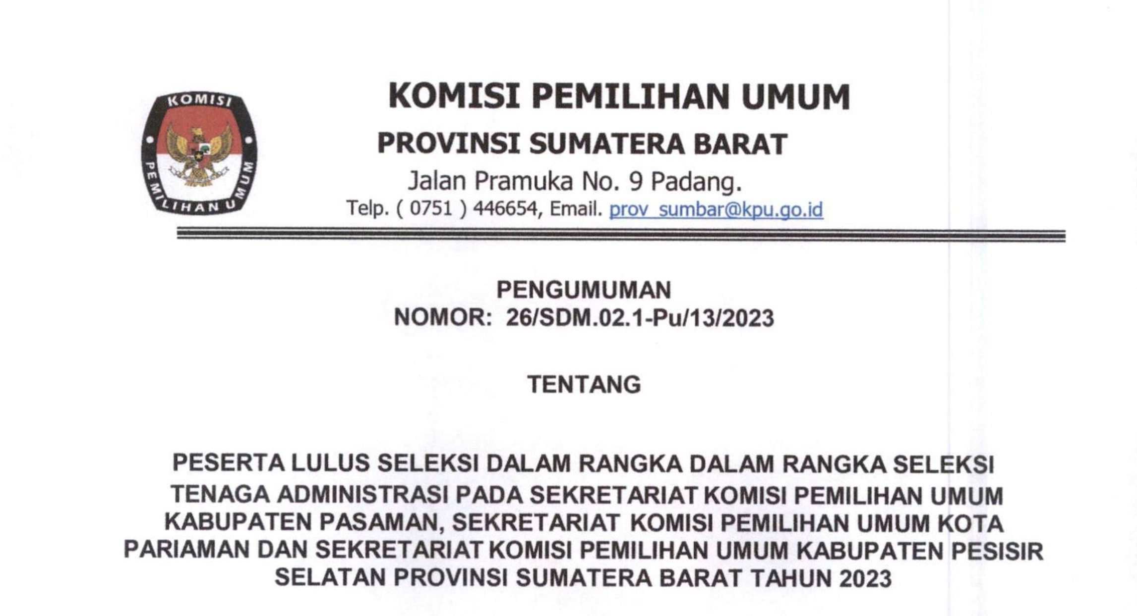 PENGUMUMAN PESERTA LULUS SELEKSI TENAGA ADMINISTRASI SEKRETARIAT KPU KAB PASAMAN, KPU KOTA PARIAMAN DAN KPU KAB PESISIR SELATAN TAHUN 2023 Jumat, 03 November 2023 18:27 144 PENGUMUMAN LIHAT DISINI Bagikan: Dilihat 144 Kali.