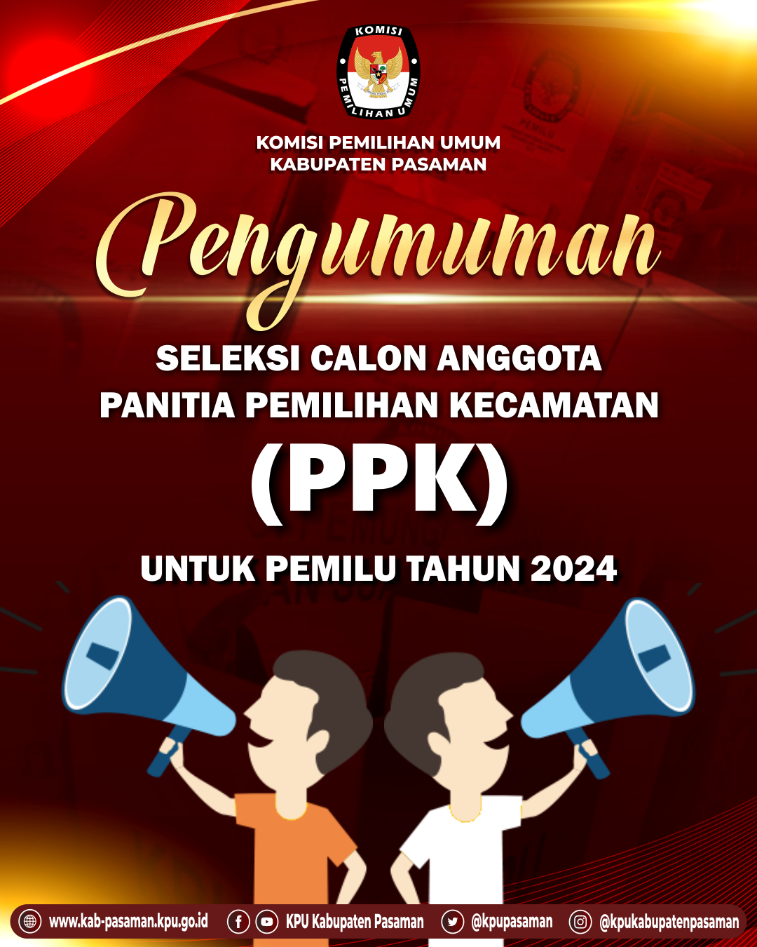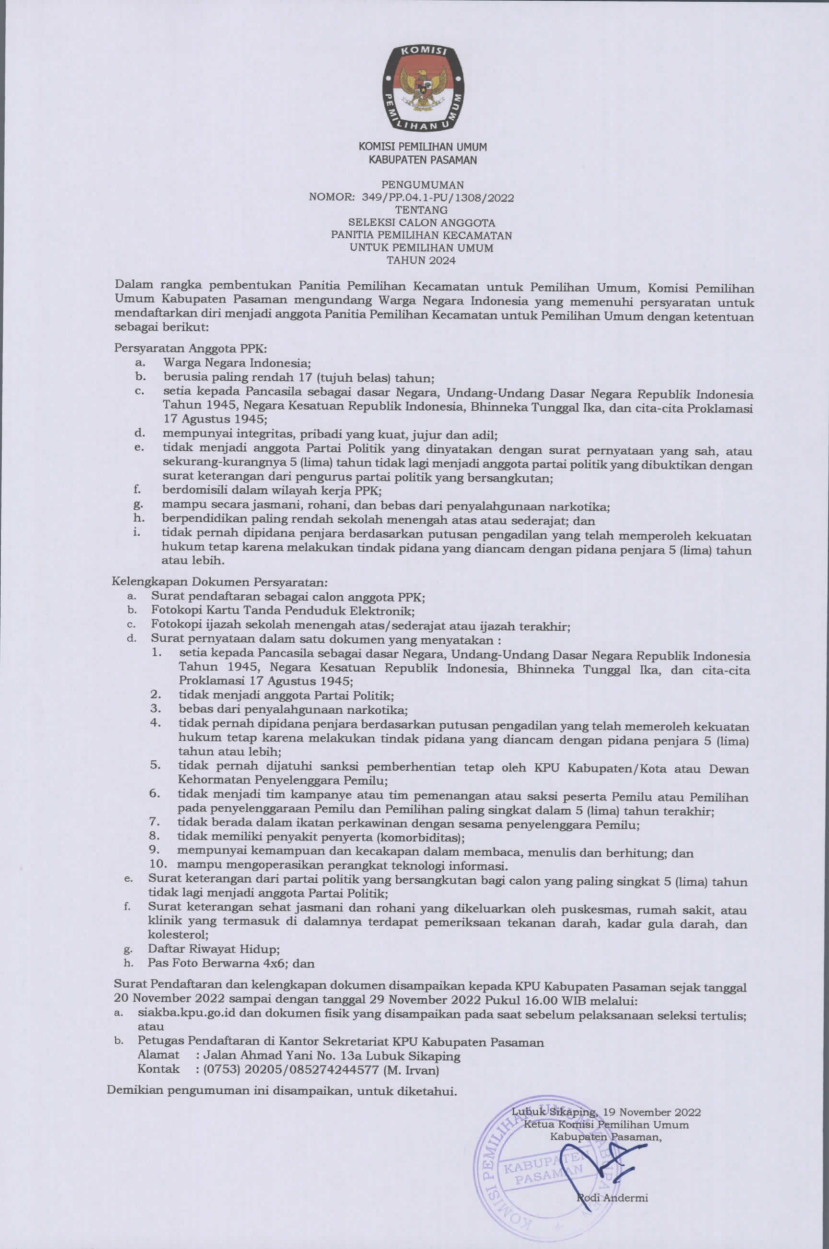 Dalam rangka pembentukan Panitia Pemililihan Kecamatan (PPK) untuk Pemilihan Umum (Pemilu) Tahun 2024, KPU Kabupaten Pasaman mengundang Warga Negara Indonesia yang memenuhi persyaratan untuk mendaftarkan diri menjadi anggota PPK untuk Pemilu Tahun 2024 dengan ketentuan sebagai berikut:
