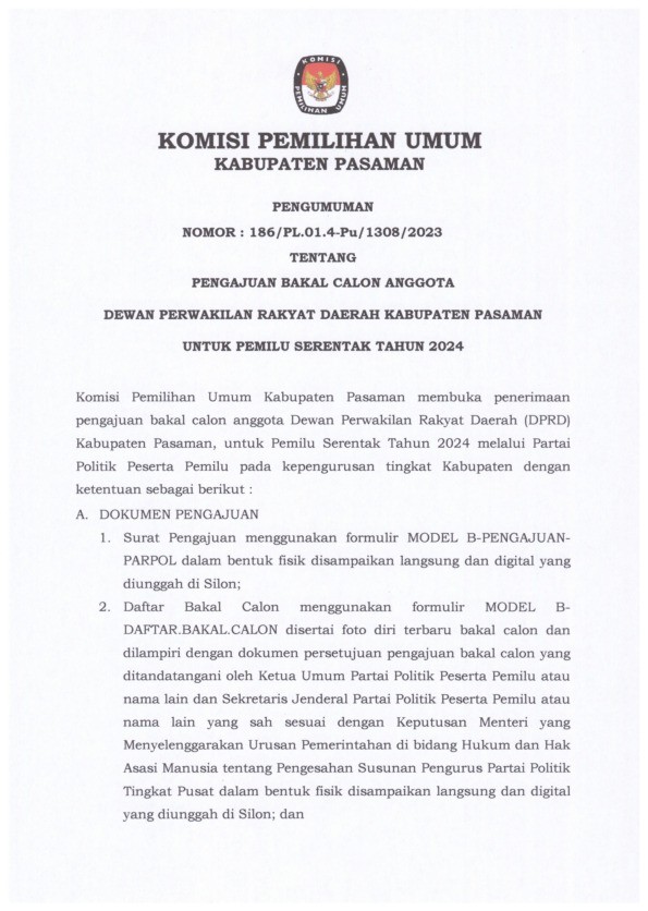 Pengumuman Tentang Pengajuan Bakal Calon Anggota Dewan Perwakilan Rakyat Daerah Kabupaten Pasaman Untuk Pemilu Serentak Tahun 2024