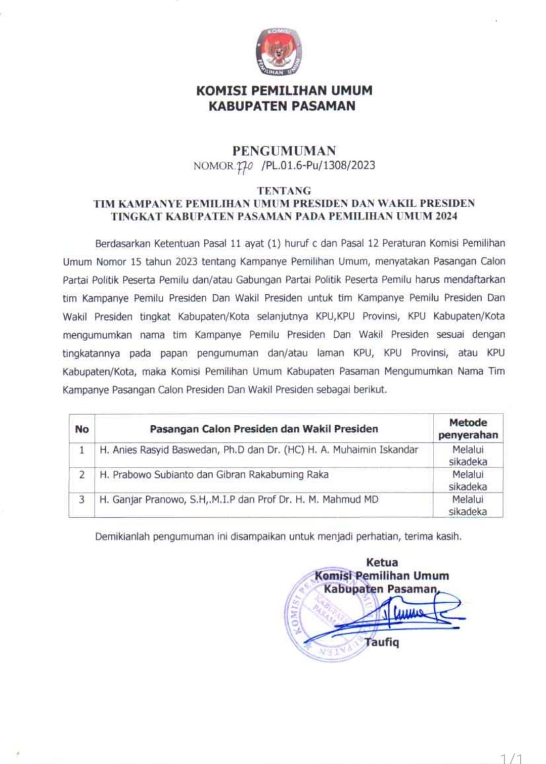 Berdasarkan Ketentuan Pasal 11 ayat (1) huruf c dan Pasal 12 Peraturan Komisi Pemilihan Umum Nomor 15 Tahun 2023 tentang Kampanye Pemilihan Umum menyatakan, Pasangan Calon, Partai Politik Peserta Pemilu, dan/atau Gabungan Partai Politik Peserta Pemilu harus mendaftarkan tim Kampanye Pemilu Presiden dan Wakil Presiden untuk tim Kampanye Pemilu Presiden dan Wakil Presiden tingkat Kabupaten/Kota selanjutnya KPU, KPU Provinsi, dan KPU Kabupaten/Kota mengumumkan nama tim Kampanye Pemilu Presiden dan Wakil Presiden sesuai dengan tingkatannya pada papan pengumuman dan/atau laman KPU, KPU Provinsi, atau KPU Kabupaten/Kota, maka Komisi Pemilihan Umum Kabupaten Pasaman Mengumumkan Nama Tim Kampanye Pasangan Calon Presiden dan Wakil Presiden sebagai berikut: