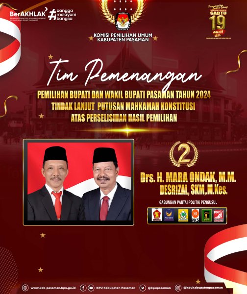 Hai #TemanPemilih, berikut disampaikan Pengumuman Tim Pemenangan Pasangan Calon Bupati dan Wakil Bupati Pasaman Tahun 2024 Tindak Lanjut Putusan Mahkamah Konstitusi , Drs. H. MARA ONDAK, M.M. dan DESRIZAL, SKM.,M.Kes