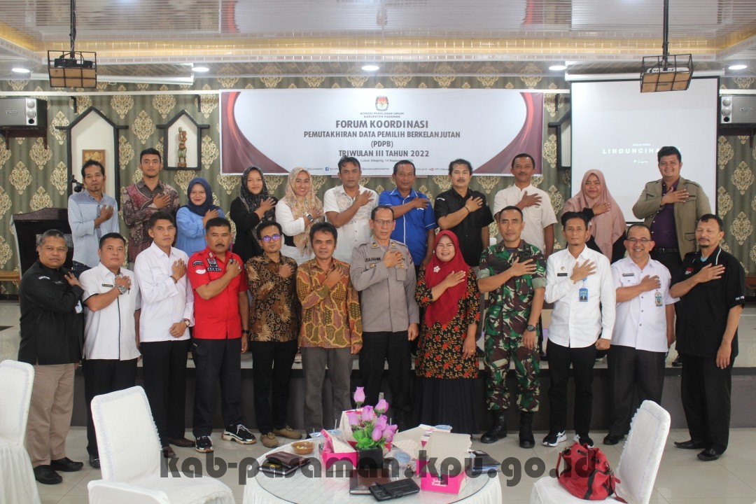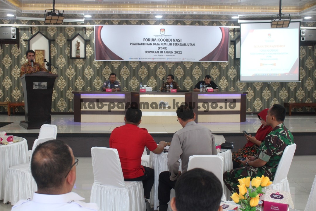 Lubuk Sikaping, www.kab-pasaman.kpu.go.id – Dengan telah dikeluarkannya Peraturan Komisi Pemilihan Umum (PKPU) Nomor 3 Tahun 2022 tentang Tahapan dan Jadwal Penyelenggaraan Pemilihan Umum Tahun 2024, Tahapan Pemutakhiran Data Pemilih akan segera dimulai, yang ditandai dengan penyerahan Daftar Penduduk Potensial Pemilih Pemilihan (DP4) oleh Kementerian Dalam Negeri (Kemendagri) kepada KPU, artinya Forum Koordinasi pada hari ini merupakan Forum Koordinasi Pemutakhiran Data Pemilih Berkelanjutan (PDPB) yang terakhir.