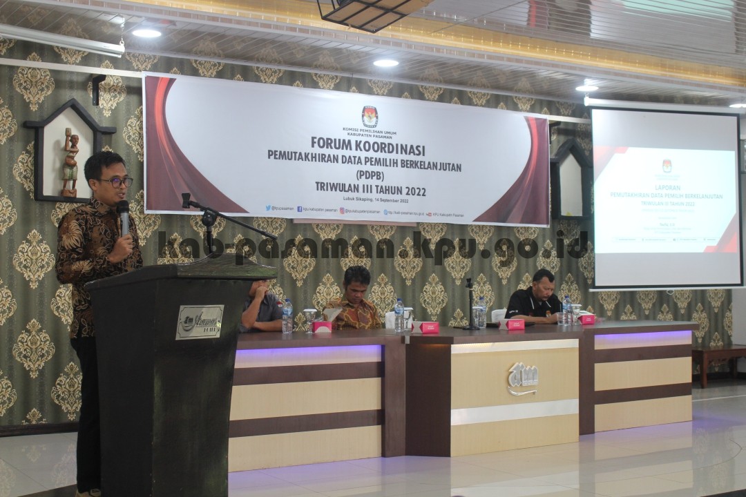 Ketua Divisi Perencanaan, Data dan Informasi (Perdatin) KPU Kabupaten Pasaman, Taufiq yang menjadi pemateri dalam forum ini menyampaikan laporan hasil PDPB Triwulan III periode bulan Juli s.d. September Tahun 2022. Berdasarkan pemutakhiran yang dilakukan, hasil perubahan PDPB bulan September 2022 terdapat 300 pemilih baru, 819 pemilih Tidak Memenuhi Syarat (TMS), dan 28 ubah data pemilih.
