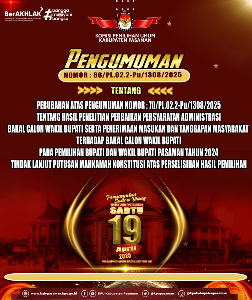 #temanpemilih, berikut disampaikan Pengumuman Nomor : 86/PL.02.2-Pu/1308/2025 tentang Perubahan Atas Pengumuman Nomor : 70/Pl.02.2-Pu/1308/2025 Tentang Hasil Penelitian Perbaikan Persyaratan Administrasi Bakal Calon Wakil Bupati Serta Penerimaan Masukan Dan Tanggapan Masyarakat Terhadap Bakal Calon Wakil Bupati Pada Pemilihan Bupati Dan Wakil Bupati Pasaman Tahun 2024 Tindak Lanjut Putusan Mahkamah Konstitusi Atas Perselisihan Hasil Pemilihan