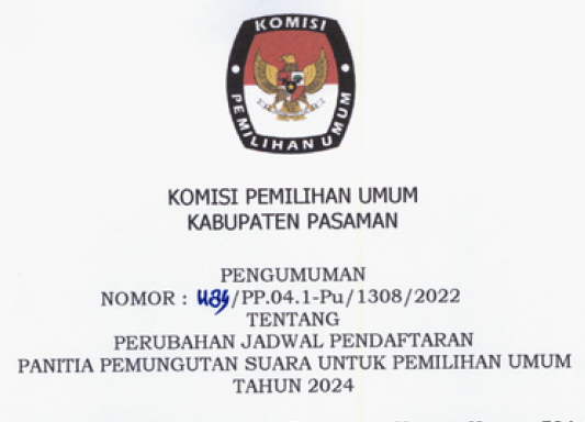 Berikut disampaikan Keputusan KPU Kabupaten Pasaman Nomor: 1184/PP.04.1-Pu/1308/2022 tentang Perubahan Jadwal Pendaftaran Panitia Pemungutan Suara Untuk Pemilihan Umum Tahun 2024.