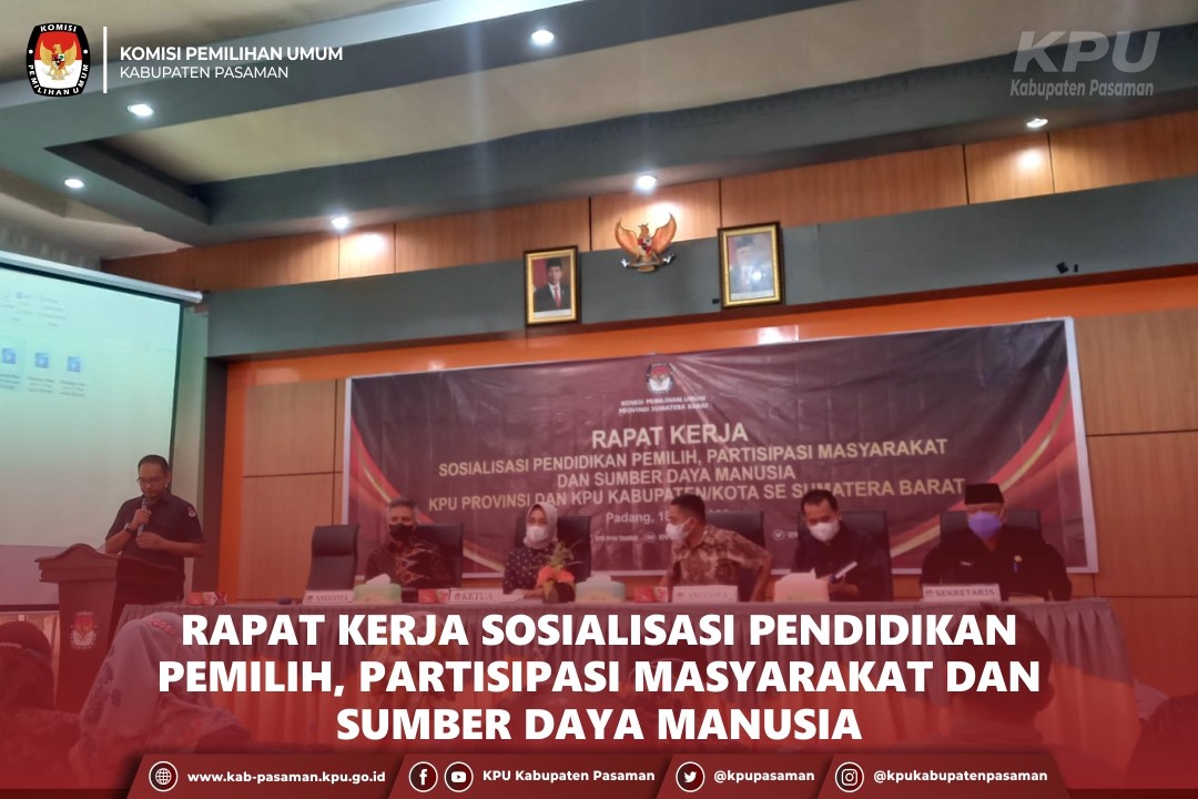 Padang, https://kab-pasaman.kpu.go.id/ - Ketua Divisi SP3MSDM KPU Kabupaten Pasaman, Eria Candra bersama Kasubbag Teknis Penyelenggaran Pemilu, Partisipasi dan Hubungan Masyarakat, Mi'ra Jinas Husna mengikuti Rapat Kerja Sosialisasi Pendidikan Pemilih, Partisipasi Masyarakat dan Sumber Daya Manusia KPU Provinsi dan KPU Kabupaten/Kota se-Sumatera Barat yang digelar oleh KPU Provinsi Sumatera Barat, Rabu (18/05).