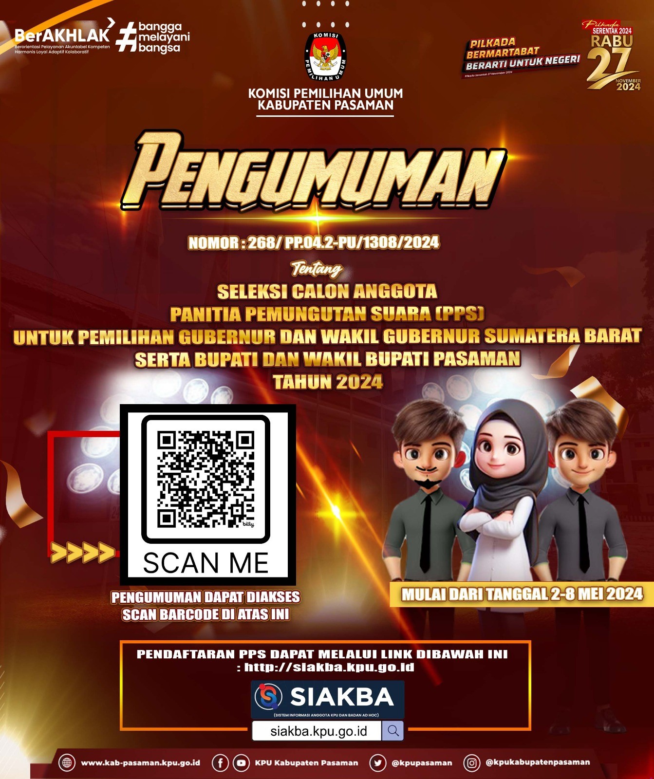Hai #TemanPemilih, Berikut disampaikan Pengumuman KPU Kabuaten Pasaman Nomor: 268/PP.04.2-PU/1308/2024 Tentang Seleksi Calon Anggota Panitia Pemungutan Suara Untuk Pemilihan Gubernur Dan Wakil Gubernur Sumatera Barat Serta Bupati Dan Wakil Bupati Pada Kabupaten Pasaman Tahun 2024.