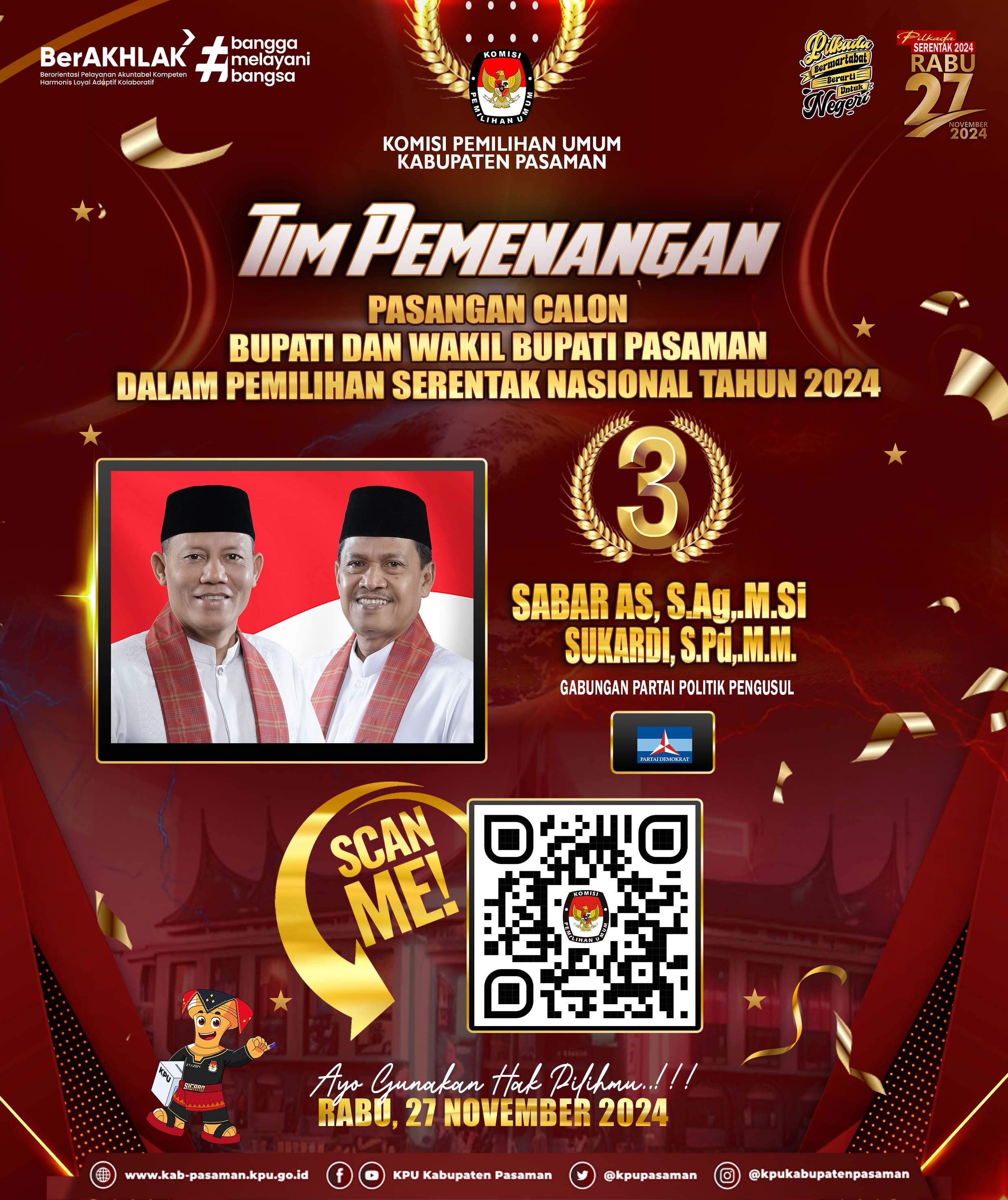 Hai #TemanPemilih, berikut disampaikan Pengumuman Tim Pemenangan Pasangan Calon Bupati dan Wakil Bupati Pasaman Tahun 2024, SABAR AS, S.Ag.,M.Si dan SUKARDI, S.Pd.,M.M