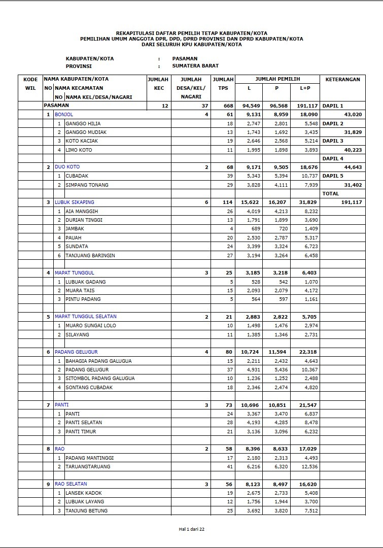 Rekapitulasi Daftar Pemilih Tetap (DPT) Kabupaten Pasaman